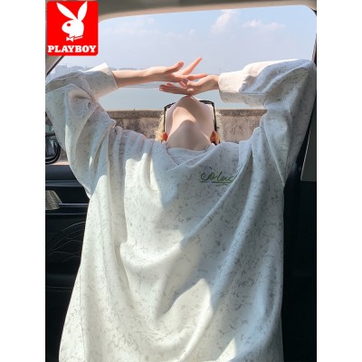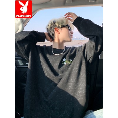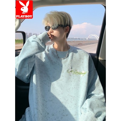花花公子美式刺绣扎染卫衣男士春秋季潮牌宽松休闲圆领重磅上衣服